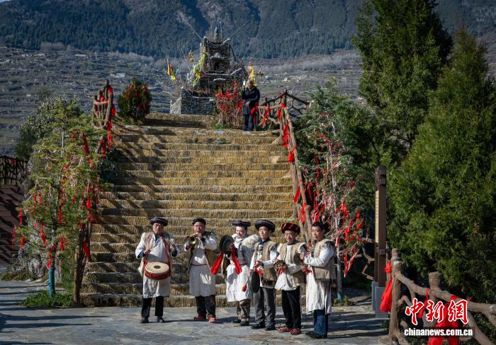 图为乌虎羌寨的羌族公众吹奏古板乐器。韩金雨 摄