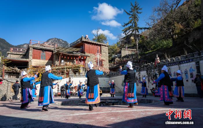 图为乌虎羌寨的羌族公众正在楼顶唱歌。韩金雨 摄